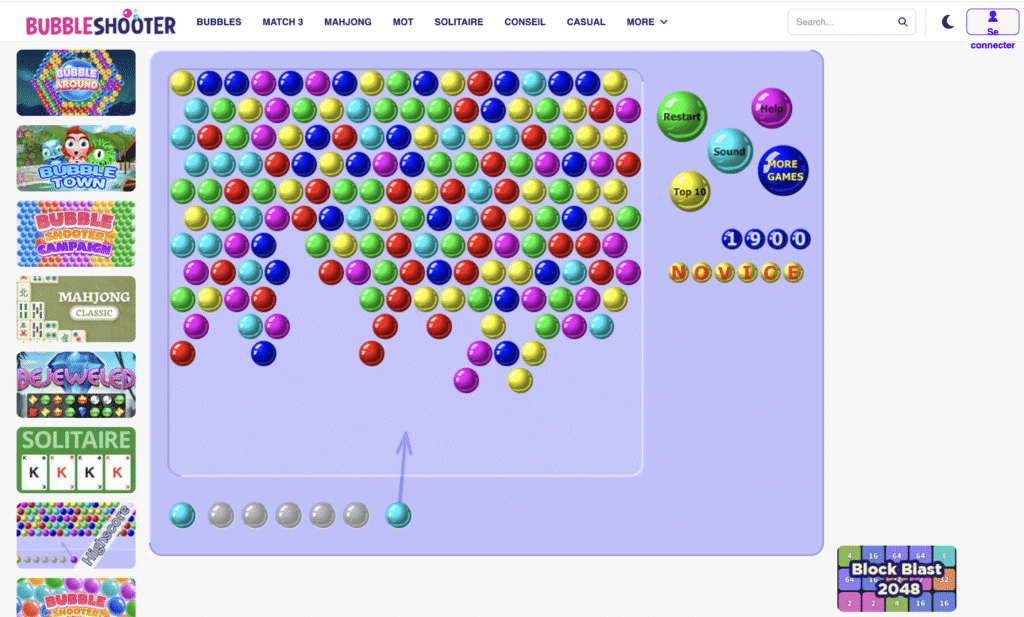 Dans Bubble Shooter, le plateau est tapissé de bulles de plusieurs couleurs. En bas de l’écran, un lanceur propulse une bulle à la fois. L’objectif est de former des groupes d’au moins trois bulles de même couleur pour les faire éclater et libérer de l’espace. Chaque tir compte, car la voûte de bulles descend progressivement : si elle atteint le bas, la partie s’arrête. La mécanique est simple, mais la maîtrise repose sur l’anticipation et la précision.