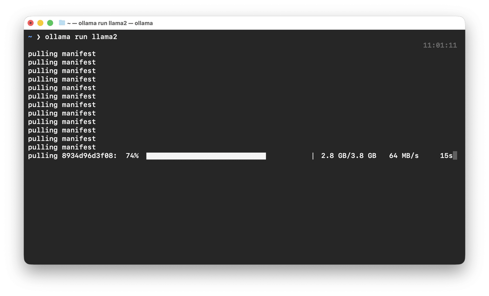 C’est tout ! La première fois que vous exécutez cette commande, Ollama va automatiquement télécharger les fichiers du modèle LLaMA 2 sur votre machine. Vous verrez une progression avec des pourcentages car le modèle pèse plusieurs gigaoctets – cela peut prendre quelques minutes selon votre connexion. Une fois le téléchargement terminé, l’app va charger le modèle en mémoire et le lancer en mode interactif.