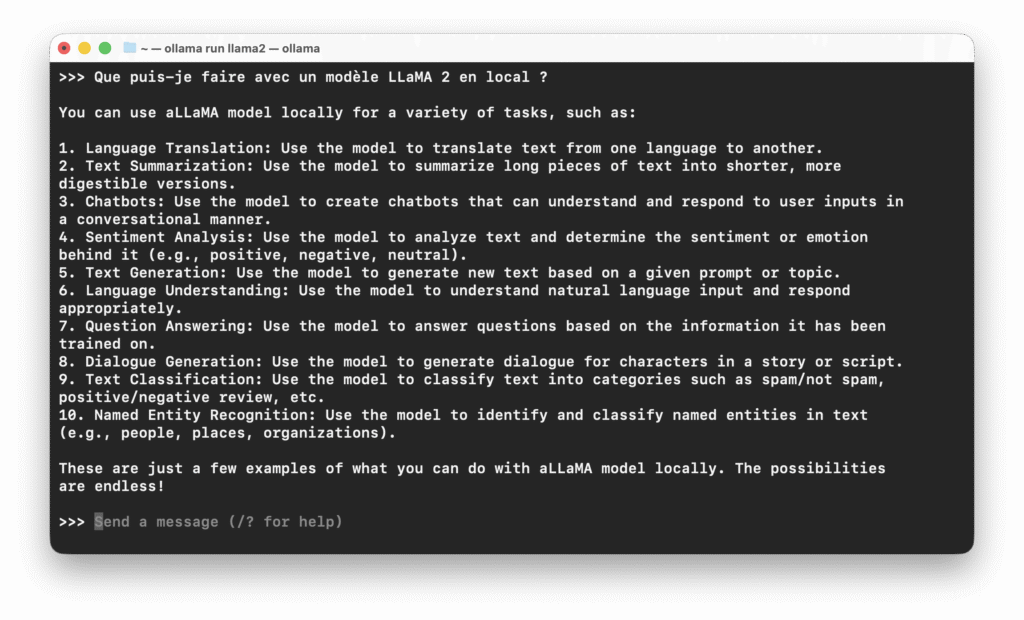 >>> Que puis-je faire avec un modèle LLaMA 2 en local ?