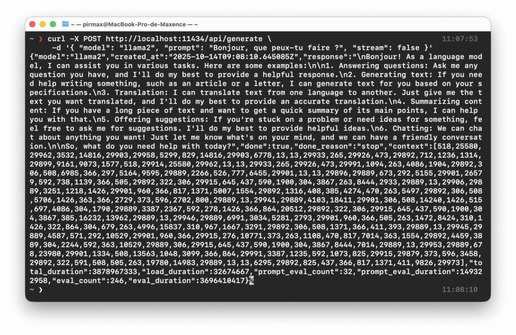 Ce qui retournera (en JSON) la réponse générée par le modèle LLaMA 2. On peut ajouter des options dans le JSON, comme stream: false pour avoir la réponse complète en une fois au lieu d’un flux, ou des paramètres de génération spécifiques.