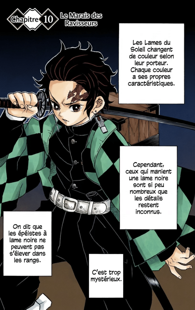Défi : Sélectionner une scène du manga en noir et blanc Demon Slayer (Demon Slayer) et la transformer en manga en couleur avec des dialogues en français.