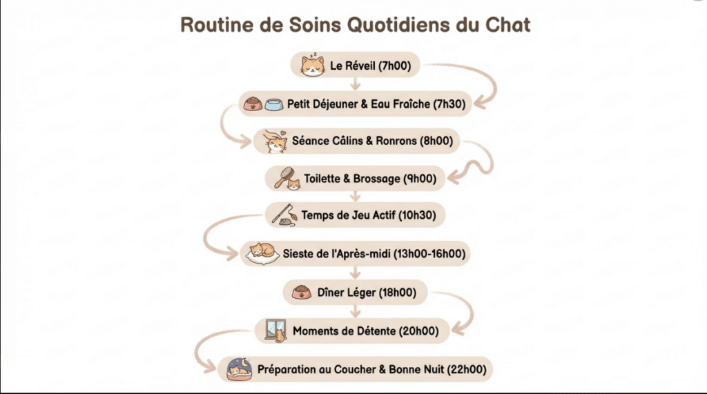 Invite : Utilisez des icônes mignonnes, des flèches douces et un texte clair en français pour créer un diagramme décrivant la journée typique d’un chat, de son réveil à son coucher. Adoptez un style d’illustration flat design, avec des tons pastel doux, un fond blanc épuré, une résolution 4K et un ratio 9:16.