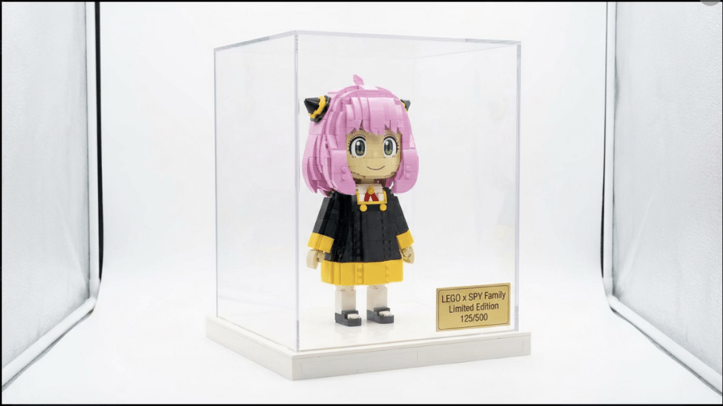Invite : Cette figurine mini d’Anya est conçue en 3D avec des briques LEGO, issue de la série LEGO x SPY Family, et exposée dans une boîte de présentation en acrylique transparent. La figurine est composée de centaines de briques LEGO colorées, chaque brique clairement visible. Les interstices entre les briques, la brillance des contours et les contrastes des textures de couleurs sont parfaitement rendus. La base de la boîte est blanche, avec une étiquette dorée indiquant « LEGO x SPY Family Limited Edition 125/500 ». La photo du produit est d’une qualité professionnelle, prise avec un éclairage doux dans une boîte à lumière, sur un fond blanc pur.