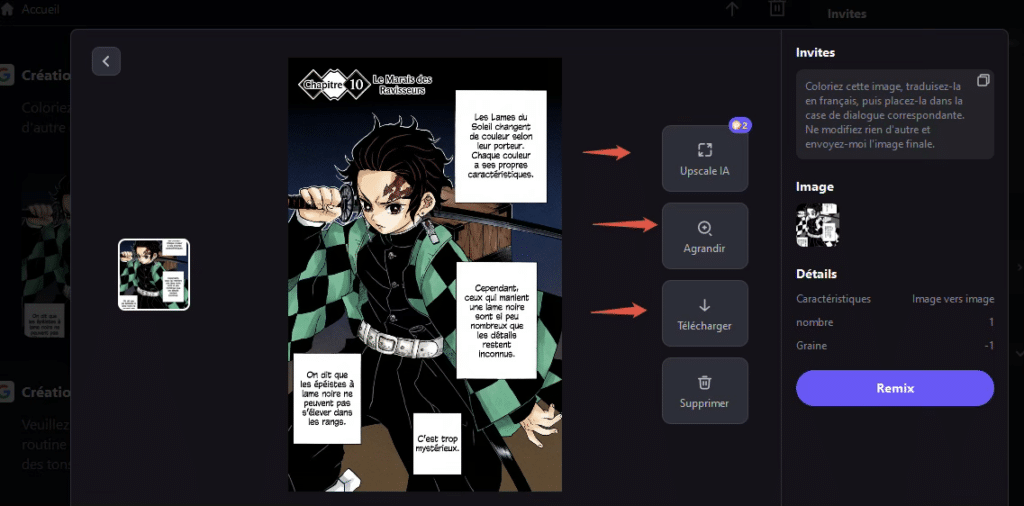 Résultat final (version professionnelle) : Impressionnant ! L’image est maintenant entièrement en couleur, fidèle à la palette officielle de l’animation (avec les tons verts et noirs pour Tanjiro). Ce qui est encore plus remarquable : les cases de dialogue ont été effacées et réécrites en parfait français, avec une police qui imite le style manga.