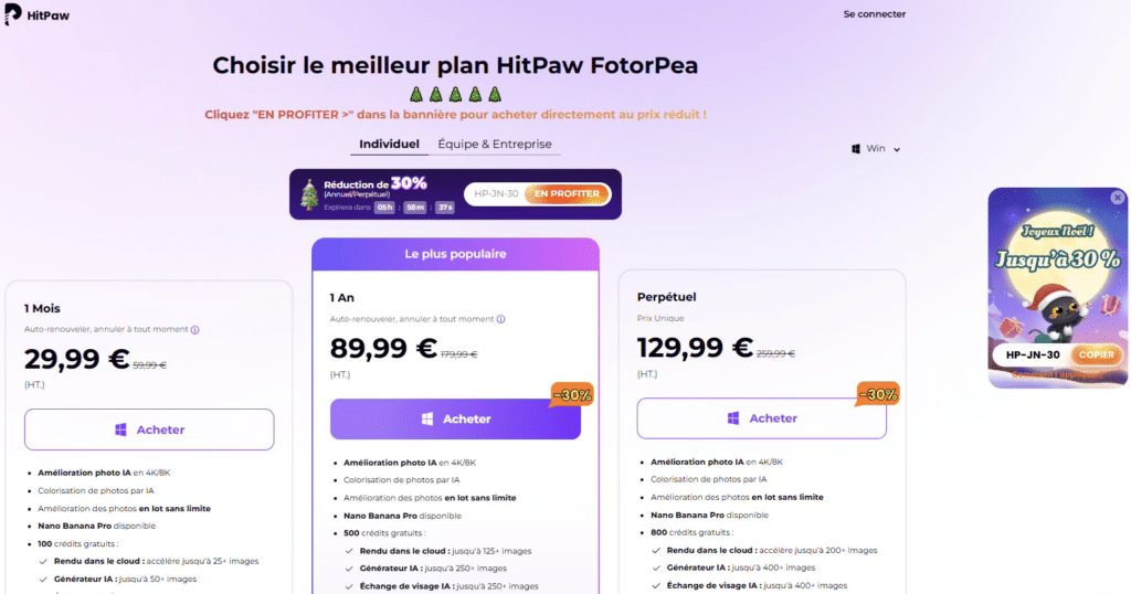 Actuellement, HitPaw FotorPea organise une promotion de Noël. En entrant le code promo HP-CMNC-30, vous pouvez bénéficier d’une réduction allant jusqu’à 30% sur tous les plans d’abonnement ! Ne manquez pas cette occasion et abonnez-vous maintenant pour profiter de ces réductions.